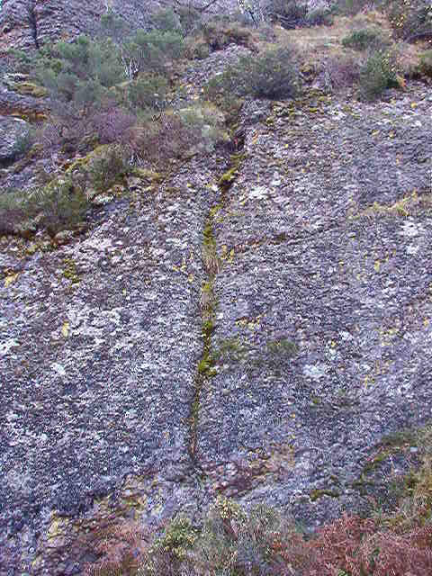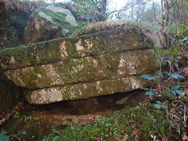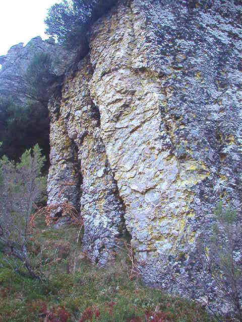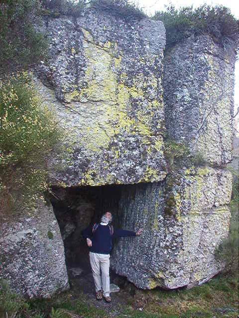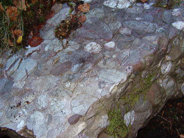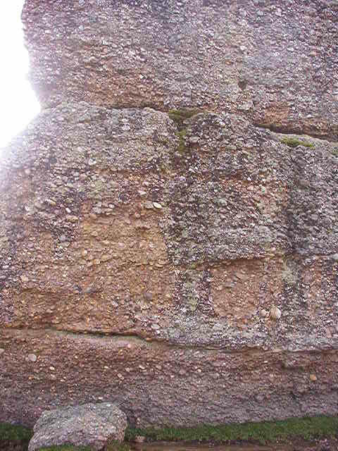 Se aprecia que está partida por la mitad, el bloque de la derecha se ha desplazado hacia abajo. Esto demuestra que estos conglomerados, no se apoyan sobre terreno de la misma composición, es decir, conglomerados. De hecho, la piedra que aparece bajo el césped es pizarra. Esto implica que estos bloques han sido colocados en este lugar. |