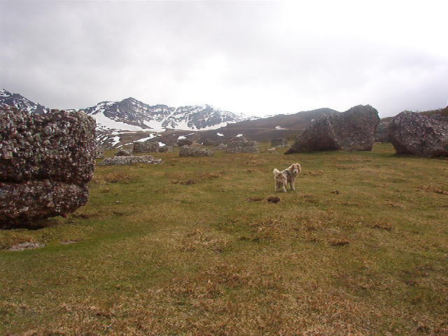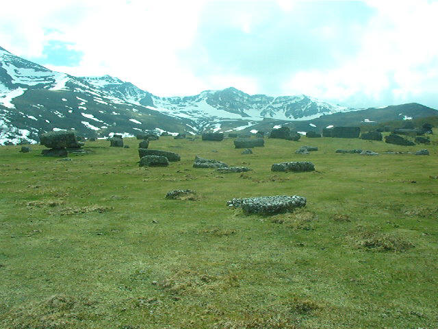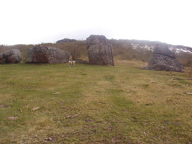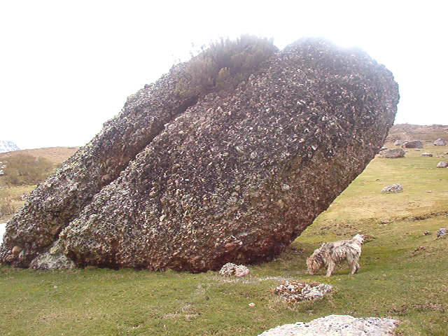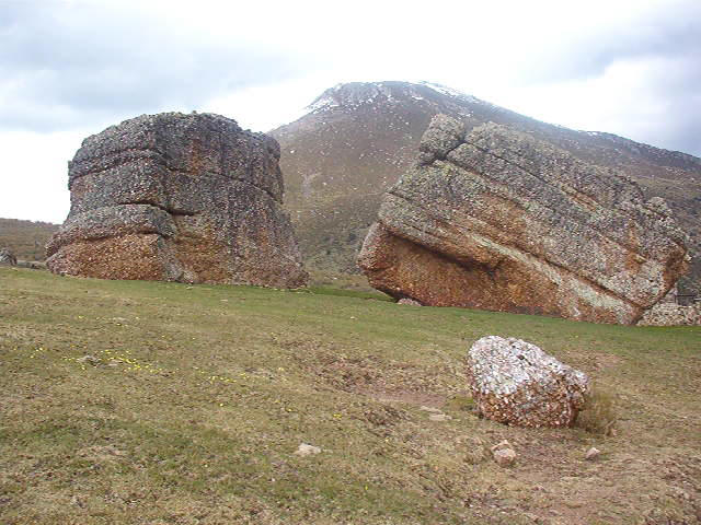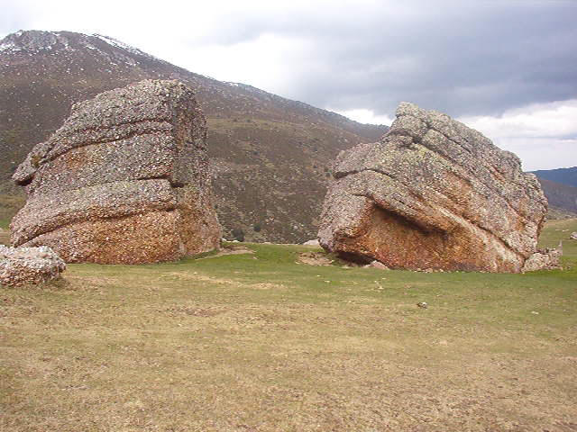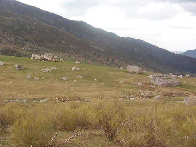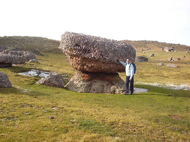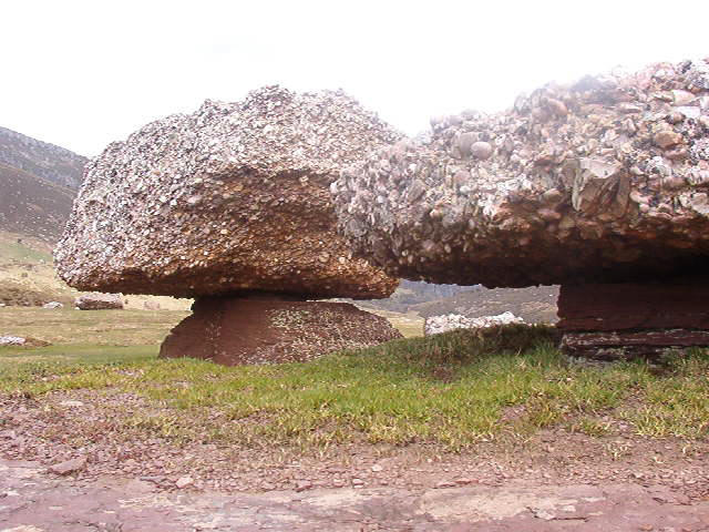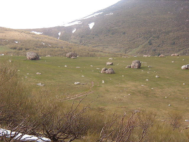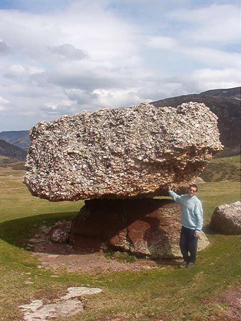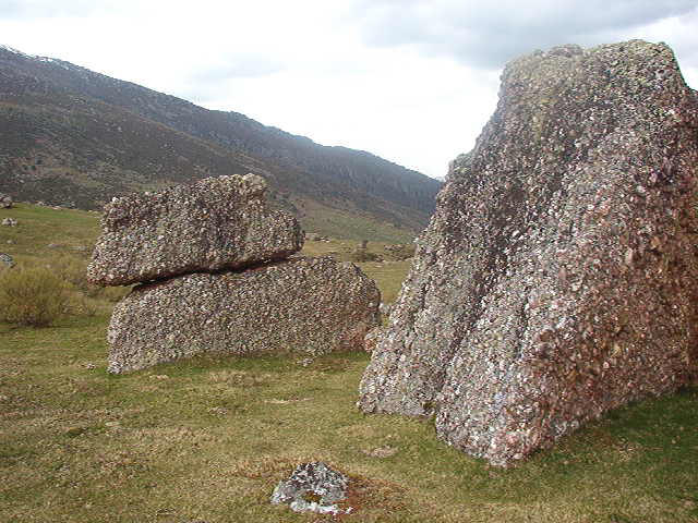 | En las fotos posteriores se muestra una zona en la que hay bloques de conglomerado, que de forma inexplicable, aparecen colocados en una pradera. |